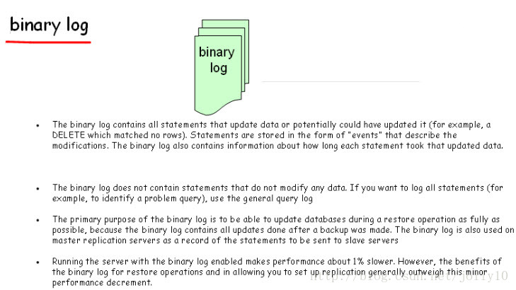 备份:在某个时间点a做了一次备份,然后利用binary log记录从这个时间点a后的所有数据库的改动,然后下一次还原的时候,利用时间点a的备份文件和这个binary log文件,就可以将数据还原。