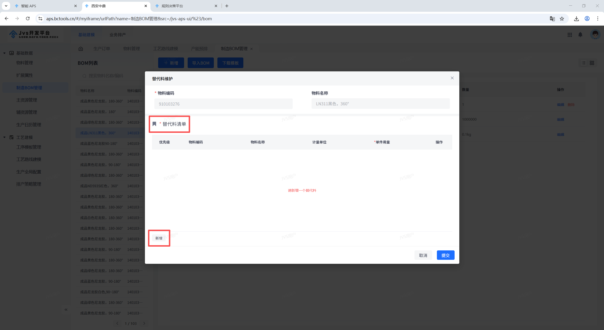 4、BOM支持替代料,很多工厂存在替代料情况。可在BOM里进行编辑新增维护替代料,系统排产时若当前料库存不足时就会去查找替代料库存情况进行排产。