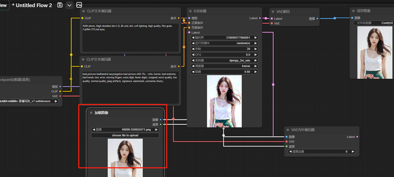 在ComfyUI中有多种方式可以实现局部重绘,简单的方式是使用VAE内补编码器进行局部重绘,也可以用Fooocus inpaint进行局部重绘,还可以用controlNet的inpaint模型进行局部重绘,以及使用Clip seg蒙版插件! 本篇介绍使用VAE內补编码器进行局部重绘的方法。 1、VAE内补编码器 局部重绘工作流的搭建方法:使用基础的图生图工作流,添加VAE内补编码器。 VAE内补编码器: