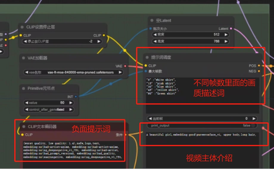 [ComfyUI进阶教程] animatediff视频提示词书写要点 4.提示词不要太复杂:comfyui的提示字符数不能太多,在animate提示词中,不要放太多的画质修饰词。5.成熟稳定的模型:使用主流的大模型,如麦橘系列(参考L站,C站等排行榜),大模型的效果比较稳定。3.手部隐藏:AI绘画对手的姿势不太友好,可以在生成的构图中隐藏手(比如增加提示词:手在背后)第一段是人物主体描述词,比如是一个女孩,穿什么衣服,在什么场景下,镜头是全身还是半身,或者特写。1个女孩,单人,黑色头发,白色连衣裙,全身,户外,中等身材,新款中式西装,帧数不能太短,不然画面会很跳。