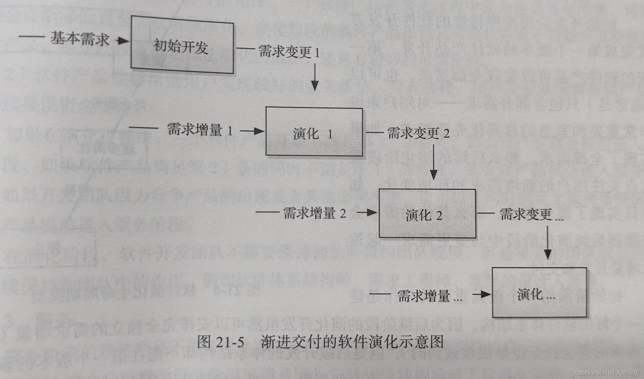 - 演化:在完成初始开发之后,软件产品就进入了演化阶段,该阶段可能会有预先安排的需求增量