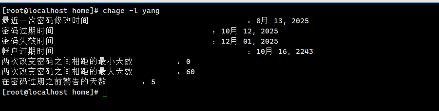 chage -l root # 查看策略 chage -M 60 root # 密码60天后过期 chage -E 2024-12-31 test # 设置账户失效日期 chage -d 0 test # 强制下次登录修改密码