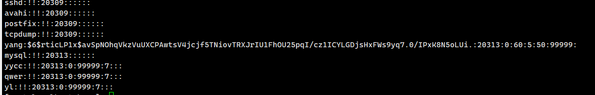 格式:用户名:加密密码:最后修改天数:最小间隔:最大有效期:警告天数:失效宽限:失效日:保留