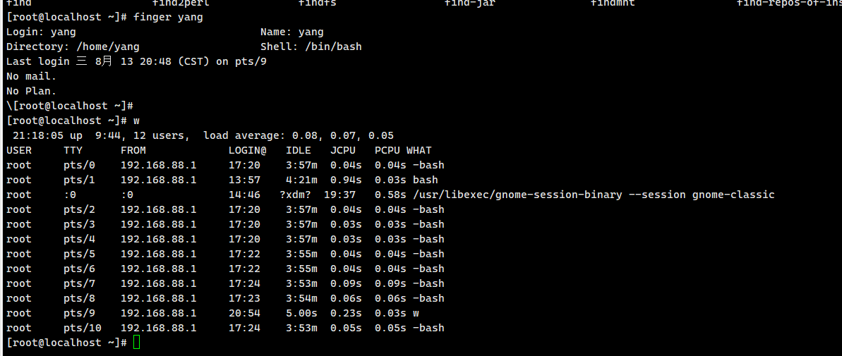 w | 已登录用户 | 用户/TTY/登录时间等 |