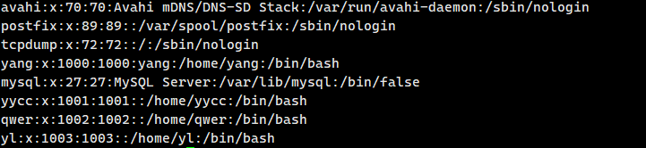 格式:用户名:密码占位符:UID:GID:描述:宿主目录:登录Shell