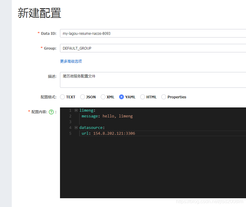Nacos Server中添加对应规则配置集,选择JSON格式(public命名空间—>DEFAULT_GROUP中添加)流控规则配置集 lagou-service-autodeliver-flow-rules