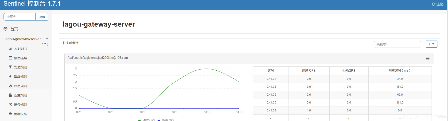 [ { "resource":"findResumeOpenState", "limitApp":"default", "grade":1, "count":1, "strategy":0, "controlBehavior":0, "clusterMode":false } ]所有属性来自源码FlowRule类