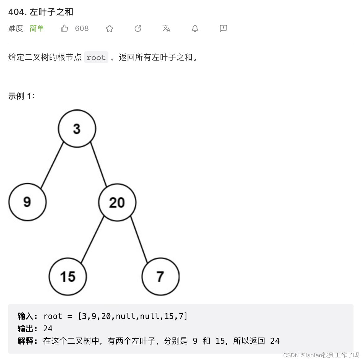 【代码随想录算法训练营14期】- day 17 第六章 二叉树part04 二叉树递归函数如果有返回值,那么遍历时要return返回值;递归函数没有返回值,答案加入数组,传递数组地址&,不需要return,直接运行函数对于第三个左叶子节点,因为返回值每次都是0return,故需要把ans放入return中,相当于每次递归都是ans+0+0;最后累计;