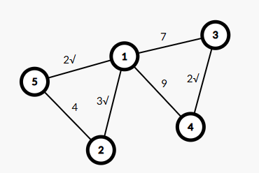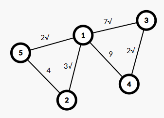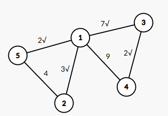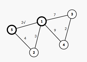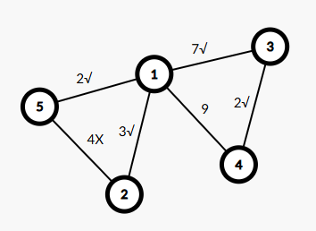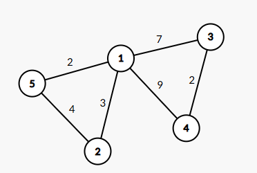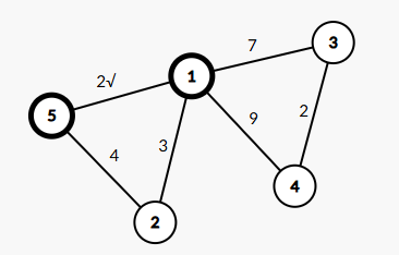 依旧使用上图,我们假设从1点开始。我们查询与1相连的边,发现权值最小为2。我们因此将5加入联通块: