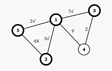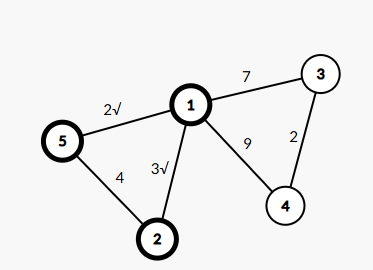 此时其实有两个联通块,(1,2,5)和(3,4),所以我们可以发现新的边2 5 4不能加入,因为两端的点属于一个联通块。我们直接跳过。此时我们加入1 3 7,联通块只有一个,程序结束。