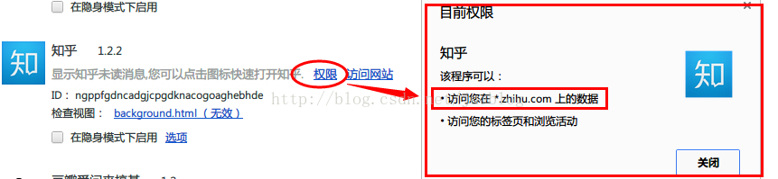 "permissions":很重要的东西,即允许插件做哪些事情,访问哪些站点,假如一个插件的"permissions"里写有“http://*.hacker.com/”,那么这个插件就被允许访hacker.com上的所有内容,包括可能会把你的一些个人信息提交给hacker.com,危险性不言而喻,查看一个插件能访问那些站点的方法是: