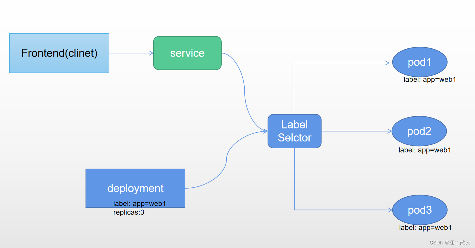 可以看到上面的架构图,service服务通过标签选择器定位后端pod,前提是service的selector必须和后端Pod标签对应上才能找到相对应的Pod,而前端frontend通过service就可以访问到后端提供服务的pod了,而service默认IP类型主要分为: