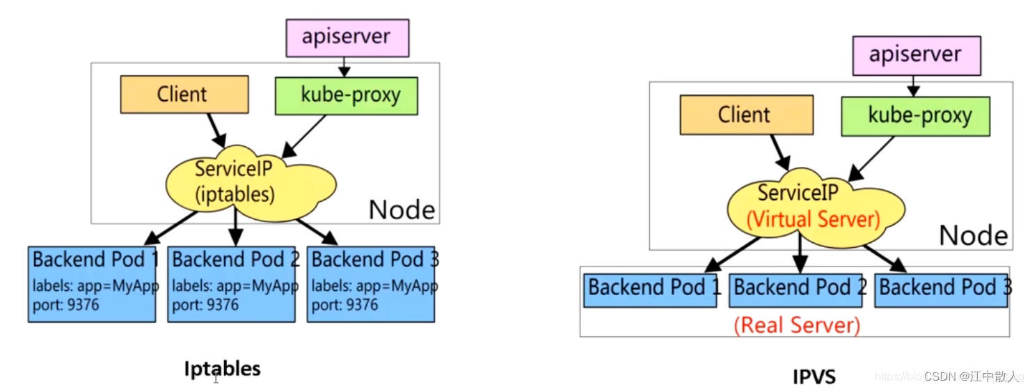 说明:userspace是在用户空间,通过kube-proxy来实现service的代理服务,service的请求会先从用户空间进入内核iptables,然后再回到用户空间,由kube-proxy完成后端Endpoints的选择和代理工作,这样流量从用户空间进出内核带来的性能损耗是不可接受的,因此这种方式已经不用了。