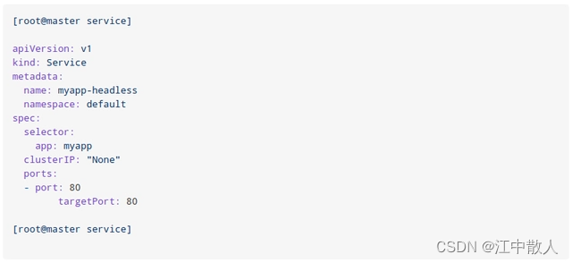 有时不需要或不想要负载均衡,以及单独的 Service IP。遇到这种情况,可以通过指定 spec.clusterIP的值为 None来创建 Headless Service 。这类 Service并不会分配 Cluster IP, kube-proxy不会处理它们,而且平台也不会为它们进行负载均衡和路由。