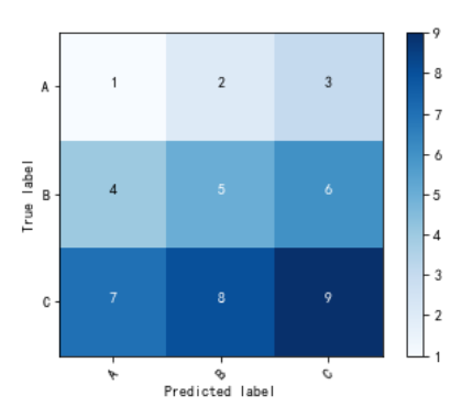 混淆矩阵的结果也经常被用来可视化成热力图的形式,横坐标表示预测的类别,纵坐标表示实际的类别,对角线依次表示实际是A、B、C类且被预测为A、B、C类的量,颜色越深表示被预测正确的量越多,效果越好。