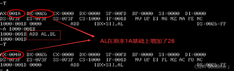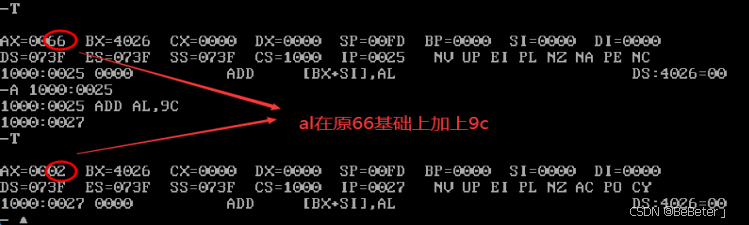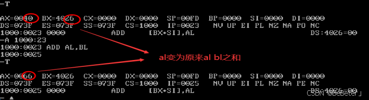 (19)使用-a指令,输入汇编指令add al,bl,再按两次回车;使用-t指令,可以看到al从40变为了66,如图19所示。