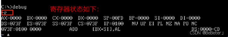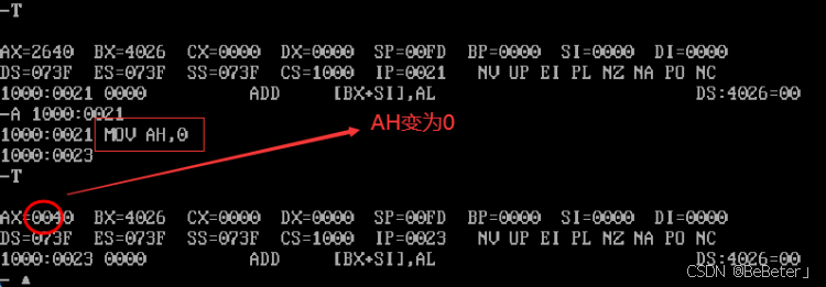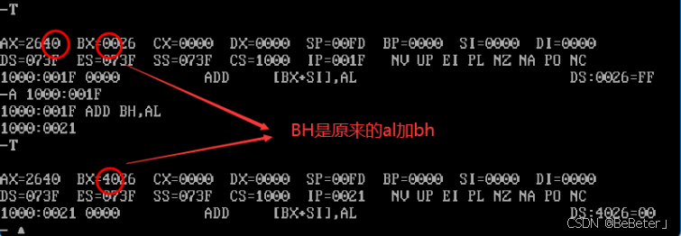 (17)使用-a指令,输入汇编指令add bh,al,再按两次回车;使用-t指令,可以看到bh从00变为了40,如图17所示。