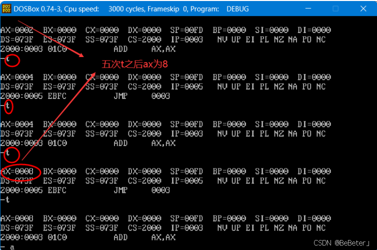 (22)连续执行5次-t指令,发现ax变为了2的3次方8;如图22所示。