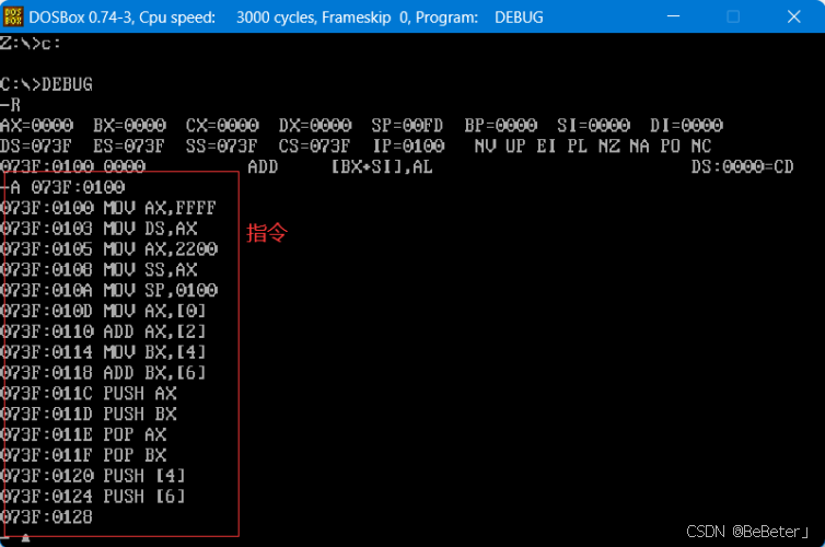 (21)使用-a指令,依次输入以下汇编指令: