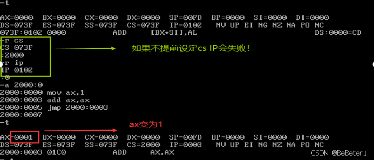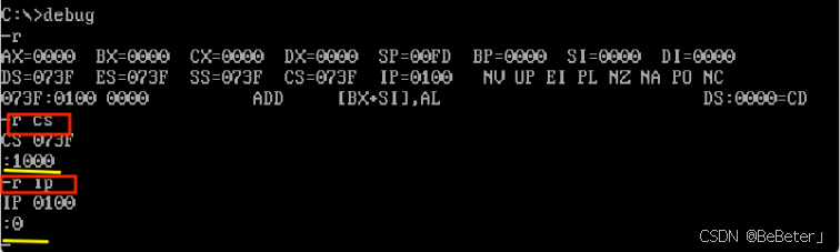 (3)使用r指令,将cs改为1000,将IP改为0;如图3所示。