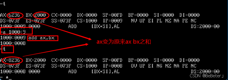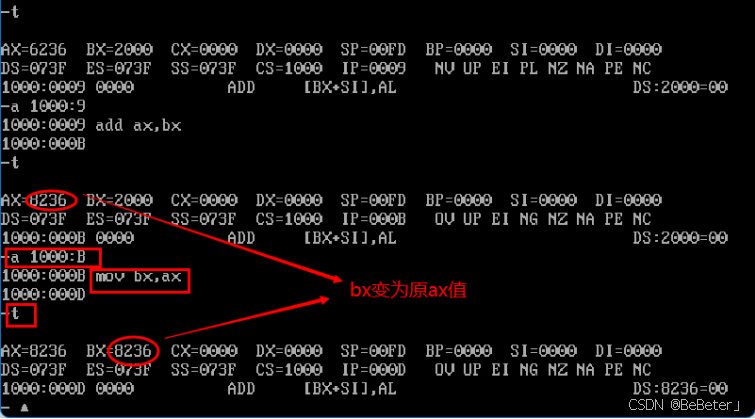 (9)使用-a指令,输入a 1000:B,回车,然后输入汇编指令MOV ax,bx,再按两次回车;使用-t指令,可以看到bx从2000变为了8236,如图9所示。
