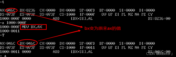 (11)使用-a指令,输入汇编指令mov bx,ax,再按两次回车;使用-t指令,可以看到bx变为了046C,如图11所示。