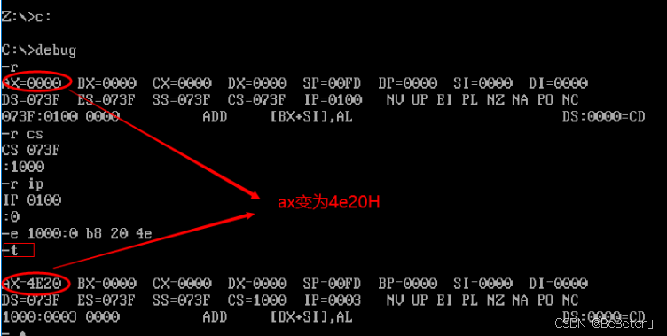 (5)使用t指令,执行指针指向位置的代码,并显示寄存器状态,发现ax数值变为了4e20H;如图5所示。