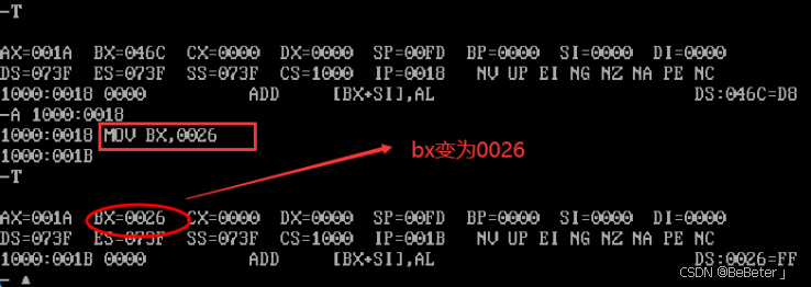 (14)使用-a指令,输入汇编指令mov bx,0026,再按两次回车;使用-t指令,可以看到bx变为了0026,如图14所示。
