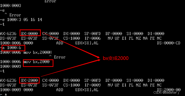 (7)使用-a指令,输入a 1000:6,回车,然后输入汇编指令mov bx,2000,再按两次回车;使用-t指令,可以看到bx从0000变为了2000,如图7所示。