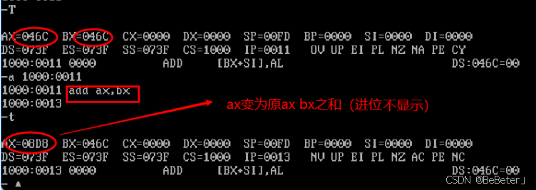 (12)使用-a指令,输入汇编指令add ax,bx,再按两次回车;使用-t指令,可以看到ax从046C变为了08D8,如图12所示。