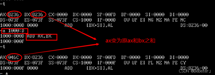 (10)使用-a指令,输入a 1000:9,回车,然后输入汇编指令add ax,bx,再按两次回车;使用-t指令,可以看到ax从6236变为了8236,如图10所示。