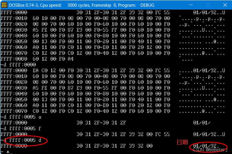 (23)使用-d指令,查看ffff:0005处的内存情况,可以看出是一个日期;如图23所示。
