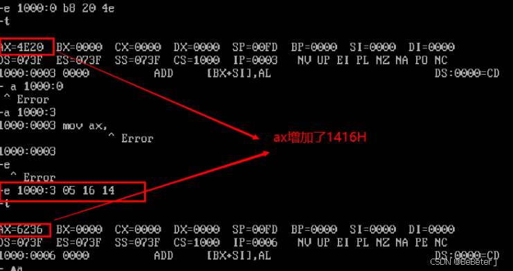 (6)使用e指令,输入e 1000:6 05 16 14(对应汇编指令为add ax,1416);使用t指令,可以看到ax增加了1416;如图6所示。