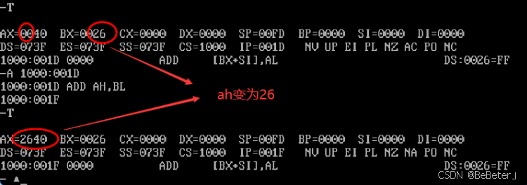 (16)使用-a指令,输入汇编指令add ah,bl,再按两次回车;使用-t指令,可以看到ah从00变为了26,如图16所示。