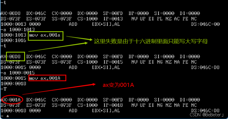 (13)使用-a指令,输入汇编指令mov ax,001A,再按两次回车;使用-t指令,可以看到ax变为了001A,如图13所示。