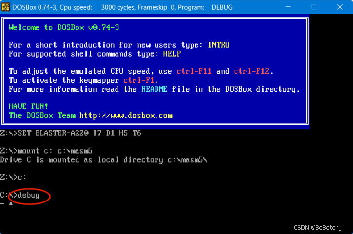 (1)打开DOSbox,在指令区输入debug,进入debug调试模式;如图1所示。