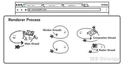 浏览器进程负责tab页中发生的所有事情,在渲染进程中,主线程处理大部分的代码,同时如果使用了web worker或者service worker,则工作线程也会处理一部分代码。合成器和光栅线程也运行在渲染进程中来高效,流畅的渲染界面。