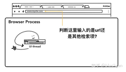 在tab网页之外的所有功能,都是由浏览器进程控制的,浏览器进程中有绘制浏览器的按钮和输入框的UI线程,网络线程来处理网络堆栈从网络中获取数据,存储线程控制文件的权限等。当输入url按下enter键后,UI线程会处理我们的输入。