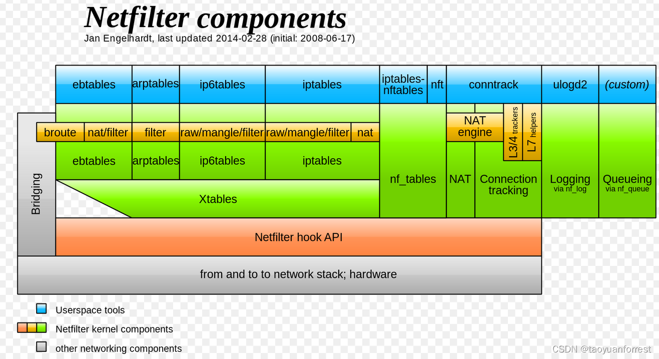 其中:etables作用域数据链路层,arptables针对ARP, iptables/ip6tables针对IP层。nftables 是新的包过滤组件.nft是相对应的新的用户态组件,用于替换etables,arptables,iptables,ip6tables.