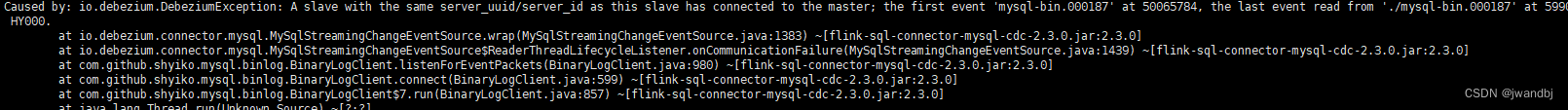 Caused by:io.debezium.DebeziumException:A slave with the same server_uuid/server_id as this slave has connected to the master;the first event 'mysql-bin.000187' at 50065784,the last event read from './mysql-bin.000187' at 59990Hy000。