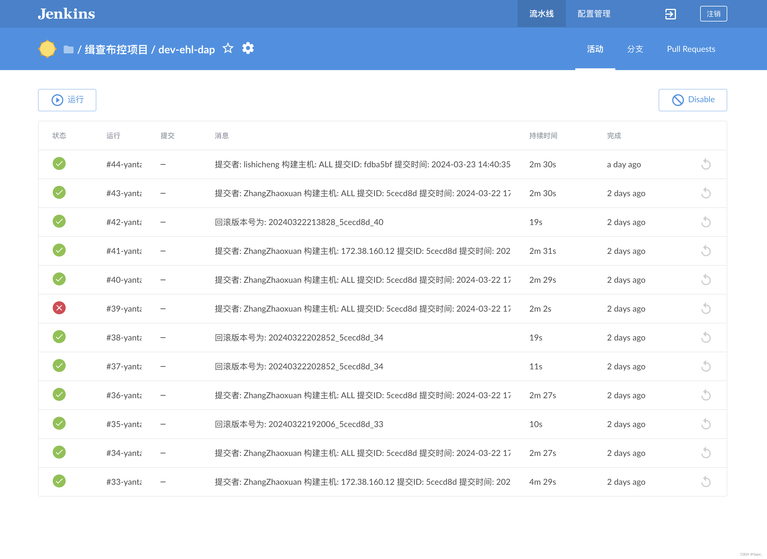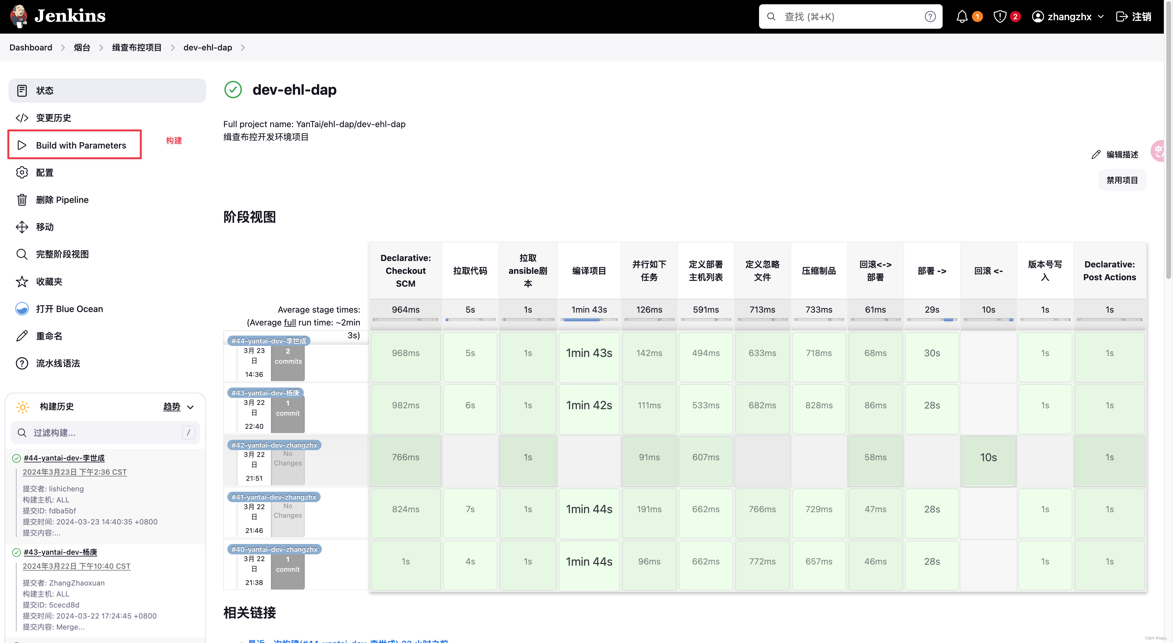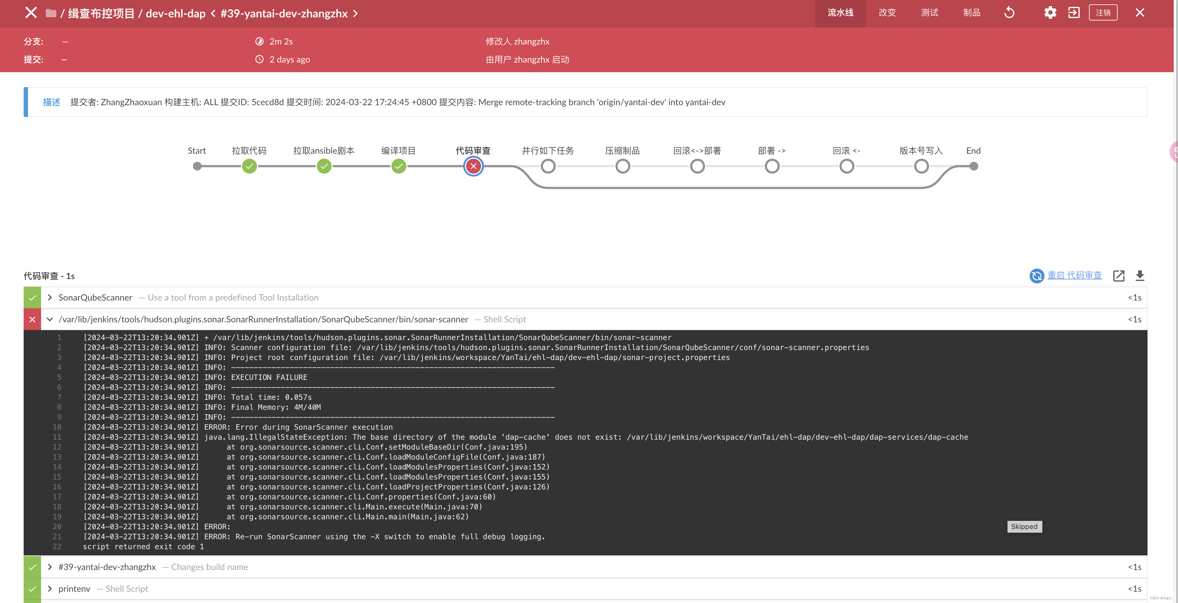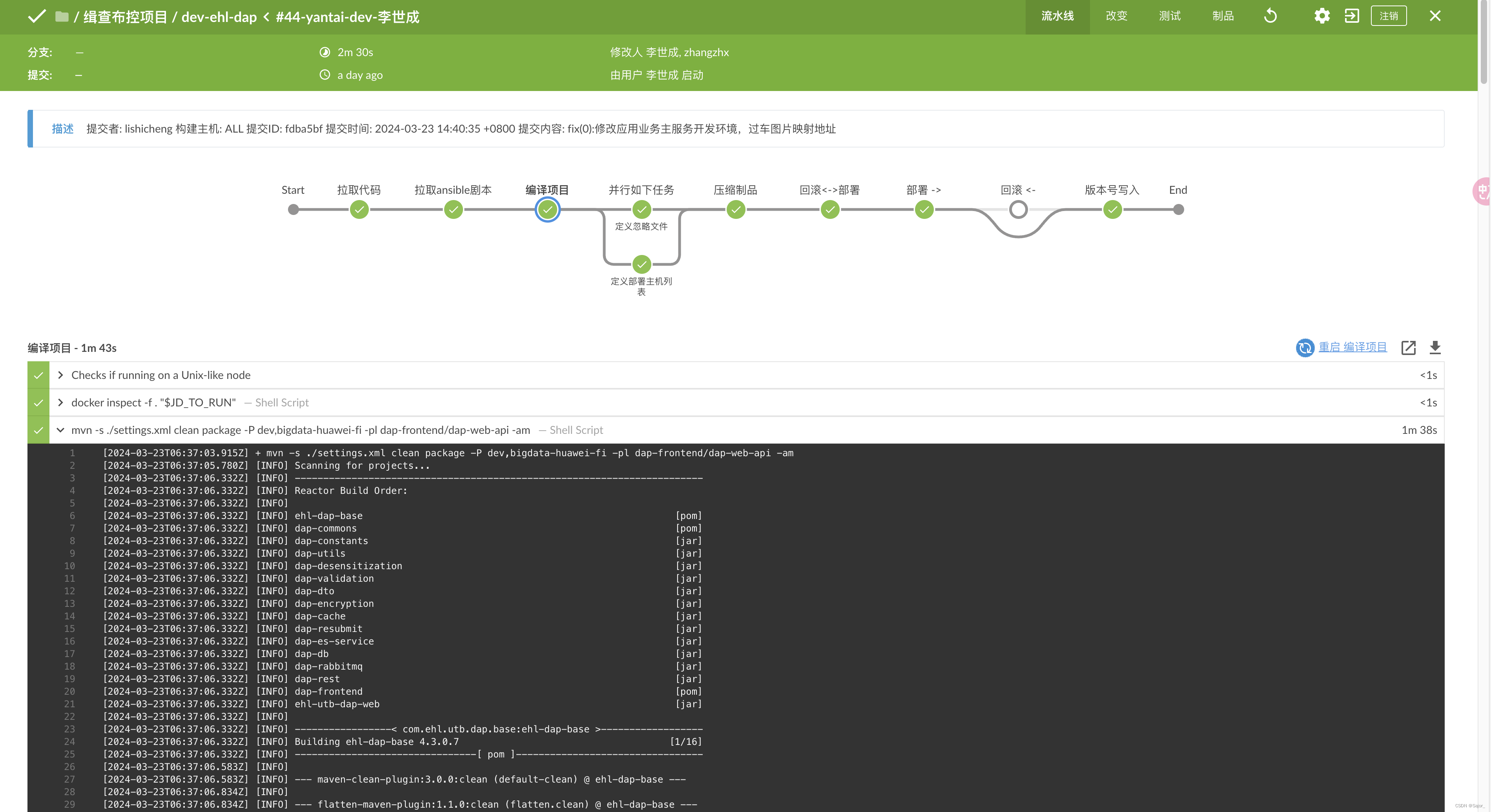 选择某一次的流水线,可以看到节点的执行情况,点击具体某个节点可以看到执行的命令日志。更方便我们分析问题。