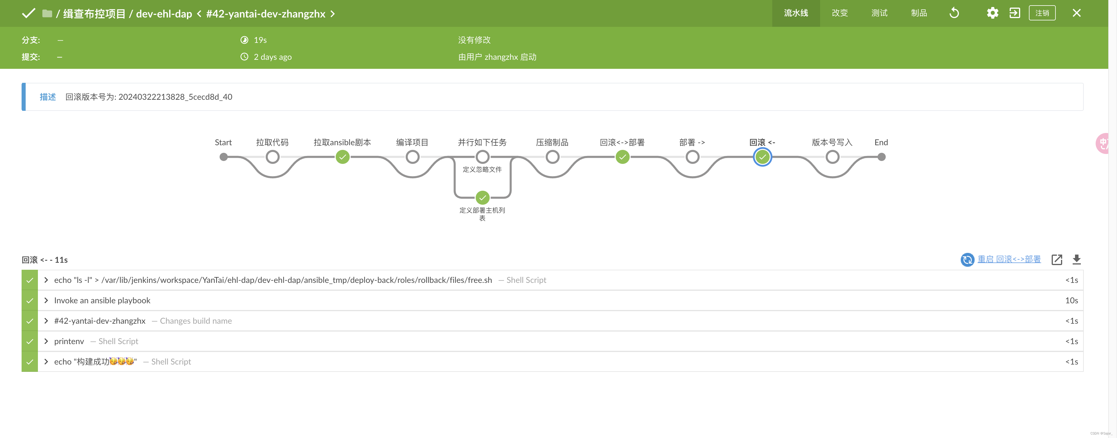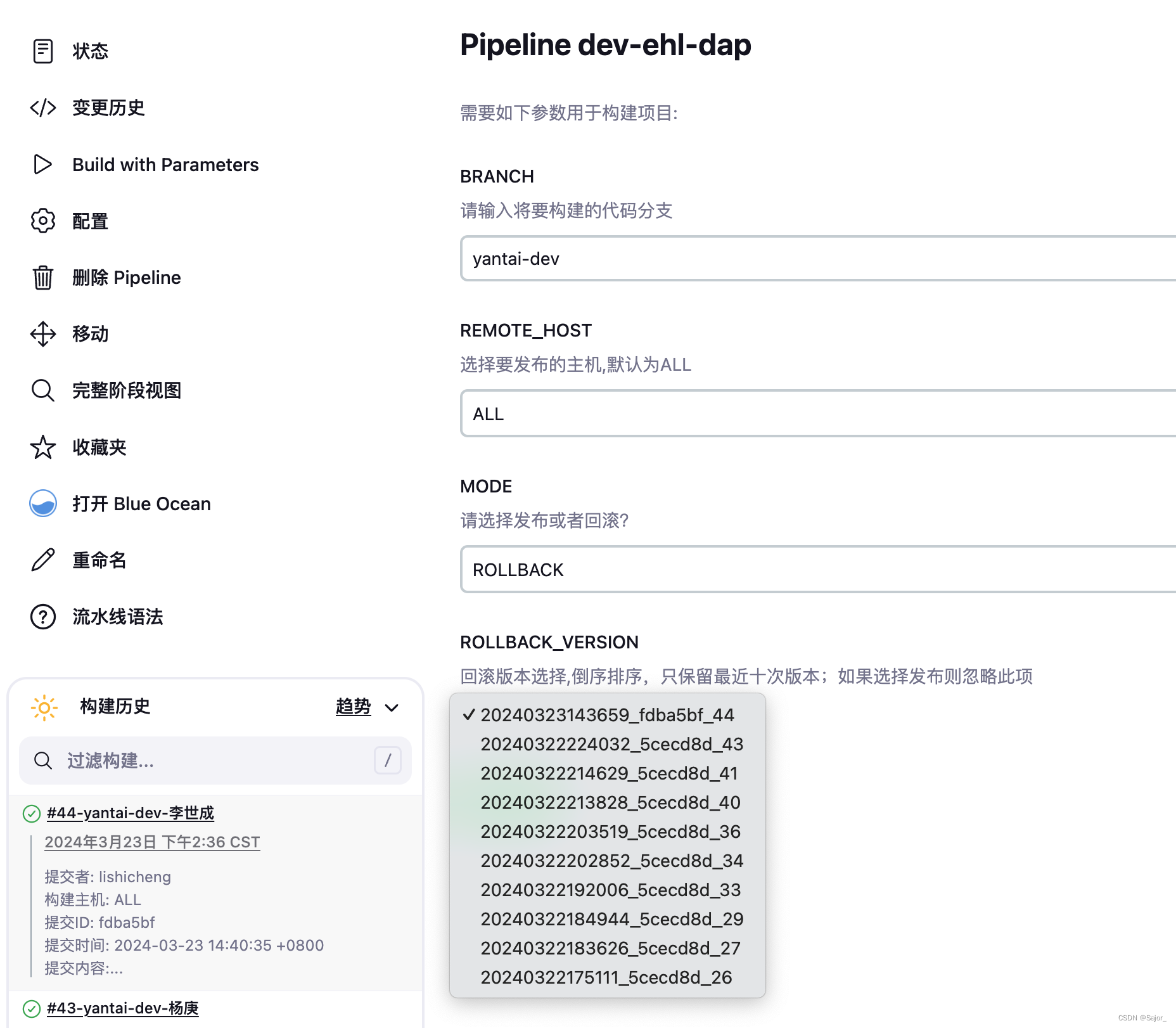选择要部署的机器,然后MODE选择ROLLBACK,版本中选择历史构建过的版本号,点击构建,即可触发回滚流程。