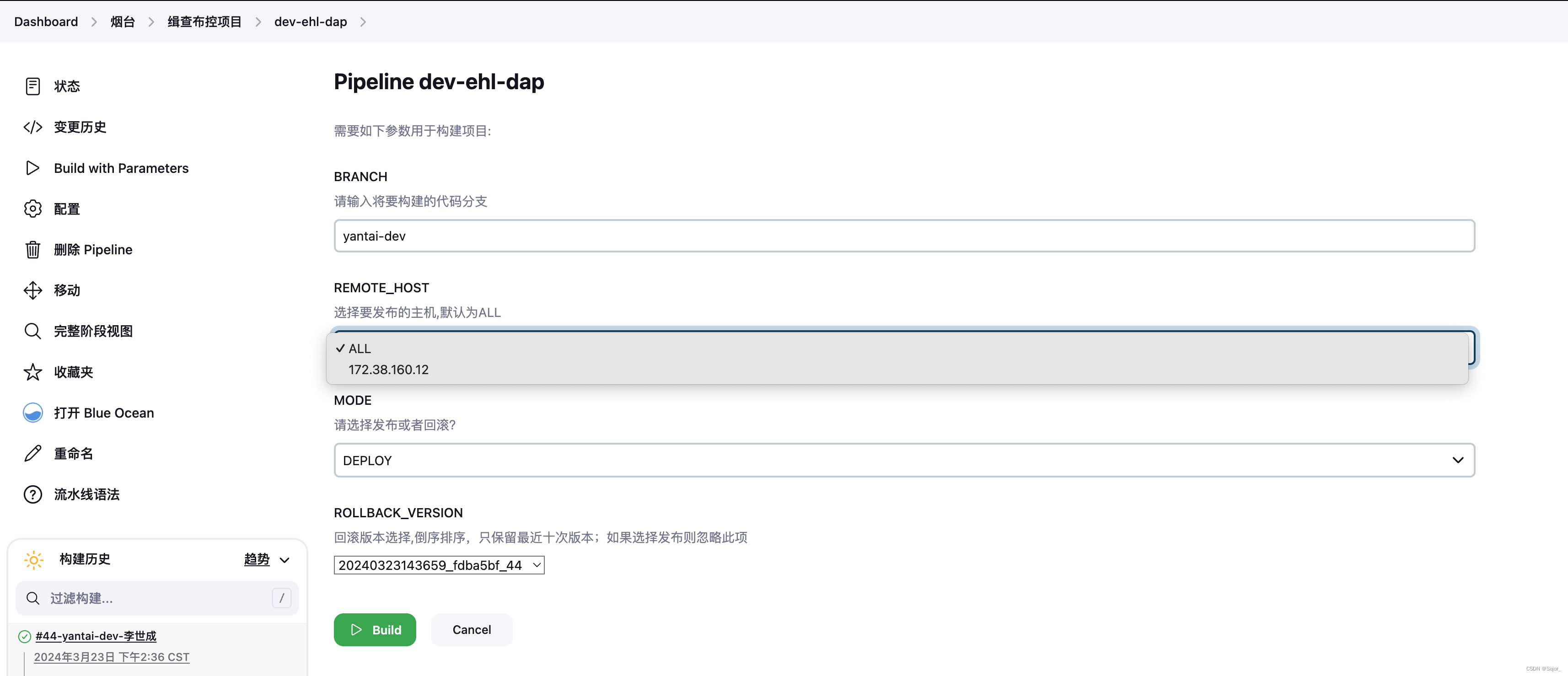 输入要构建的分支,选择构建机器,MODE选择DEPLOY,然后点击构建即可触发部署流程。