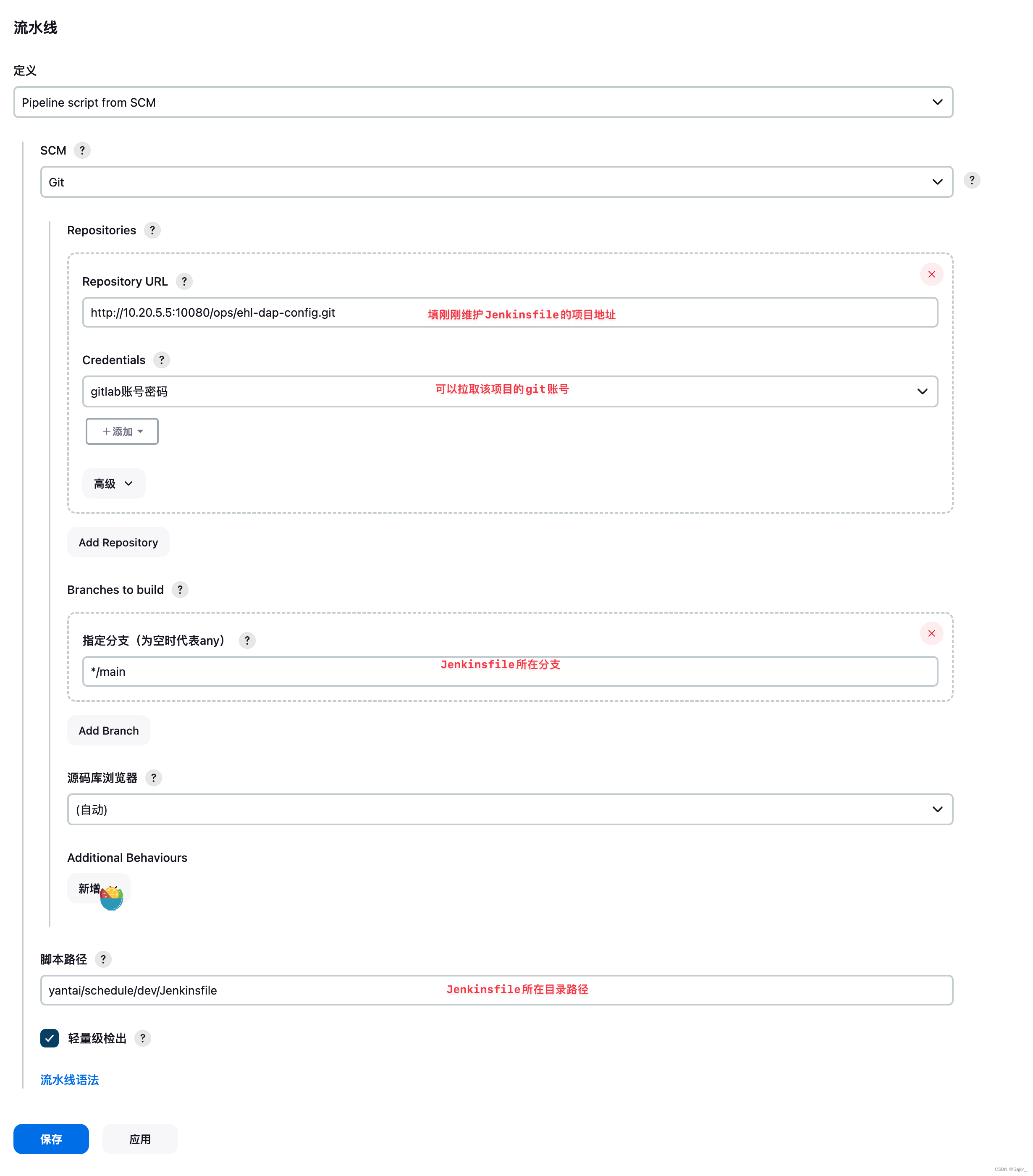 拉到底部,流水线选择 Pipeline script from SCM 直接填写流水线配置。填完点击保存