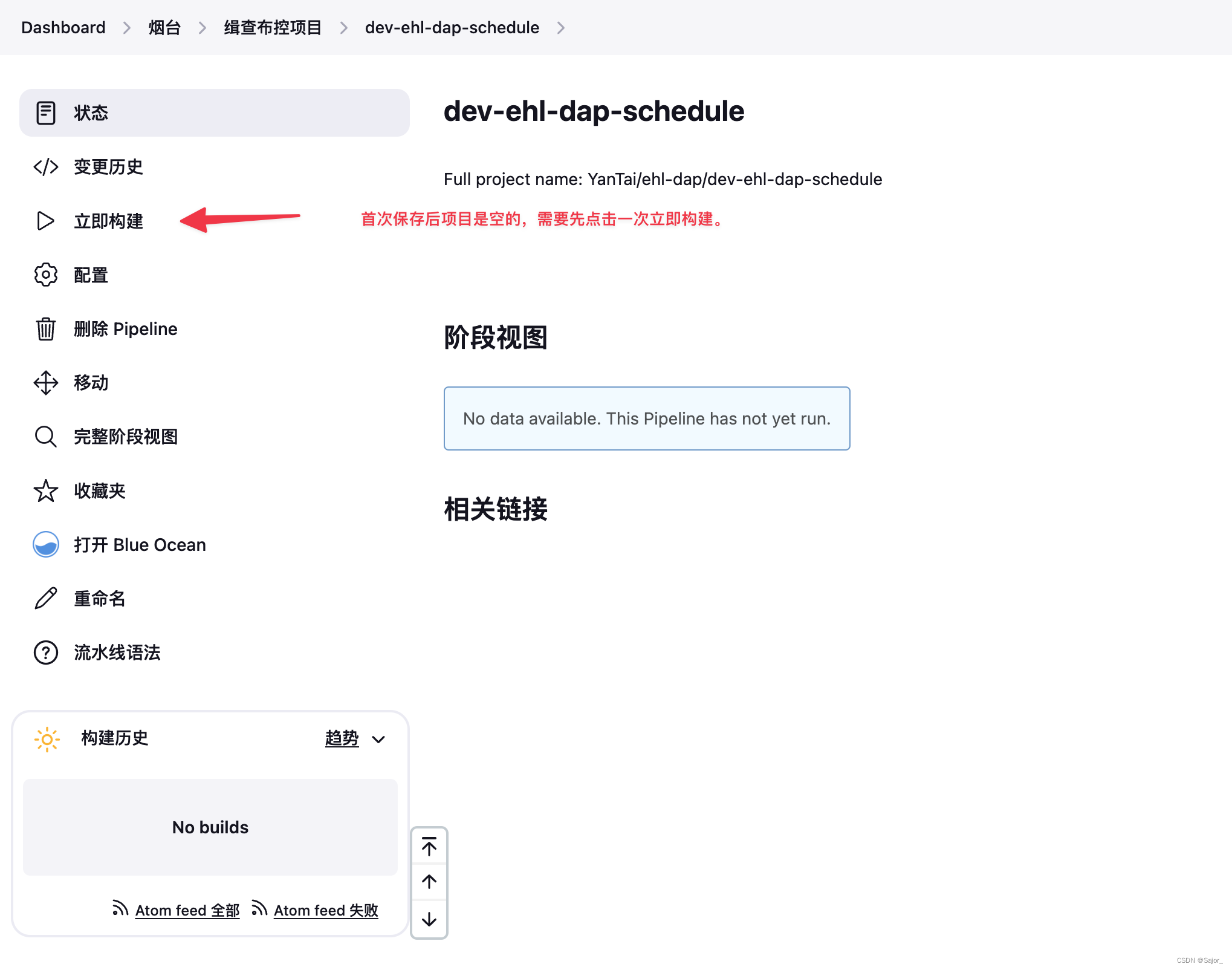 第一次保存后项目是空的,需要点击立即构建。第一次会显示失败,因为第一次是配置落位的过程。