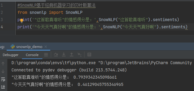 print('"今天天气真好啊"的情感得分是:',SnowNLP("今天天气真好啊").sentiments)