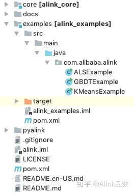 首先,我们需要一个Alink的Java工程,配置好相关环境。最简单的办法是使用Alink的example工程,下载Alink git的代码,并用Jave IDE打开项目,如下图所示,可以看到三个已经写好的示例:ALSExample, GBDTExample, KMeansExample.