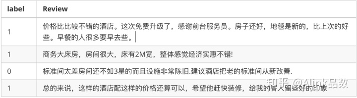 每条记录包括评论内容和标记喜好的标签,标签只有2个值:1代表喜欢,0为不喜欢。下图显示了4条数据: