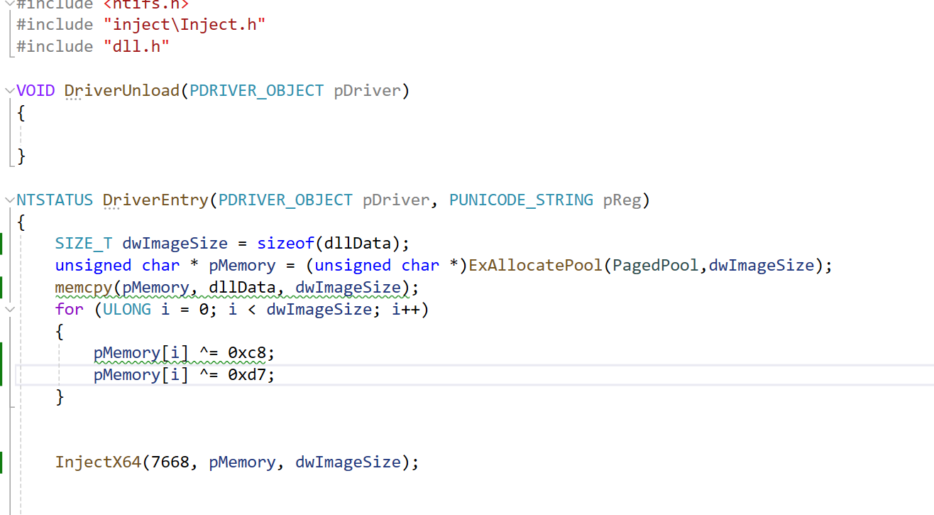 上面代码就是将dll转成shellcode编码,注意的是对每个字节进行异或进行简单的加密,因为在驱动加载的时候会调用这个生成的exe去将dll转成shellcode编码存放到dll.h的一个文件,在驱动加载时会取这个编码: