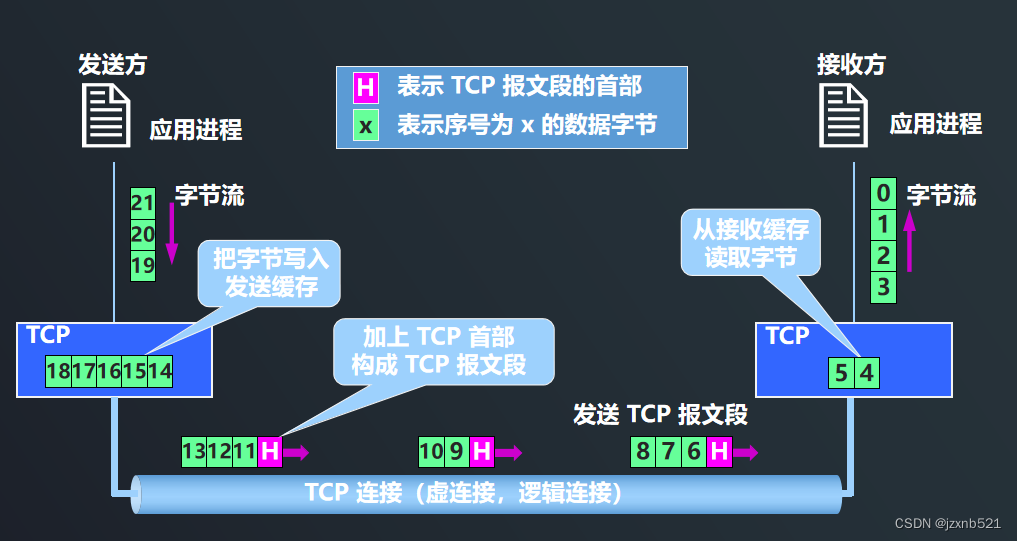 - 面向字节流 :TCP 中的“流”(stream) 指的是流入或流出进程的字节序列。 面向字节流:虽然应用程序和 TCP 的交互是一次一个数据块,但 TCP 把应用程序交下来的数据看成仅仅是一连串无结构的字节流。
